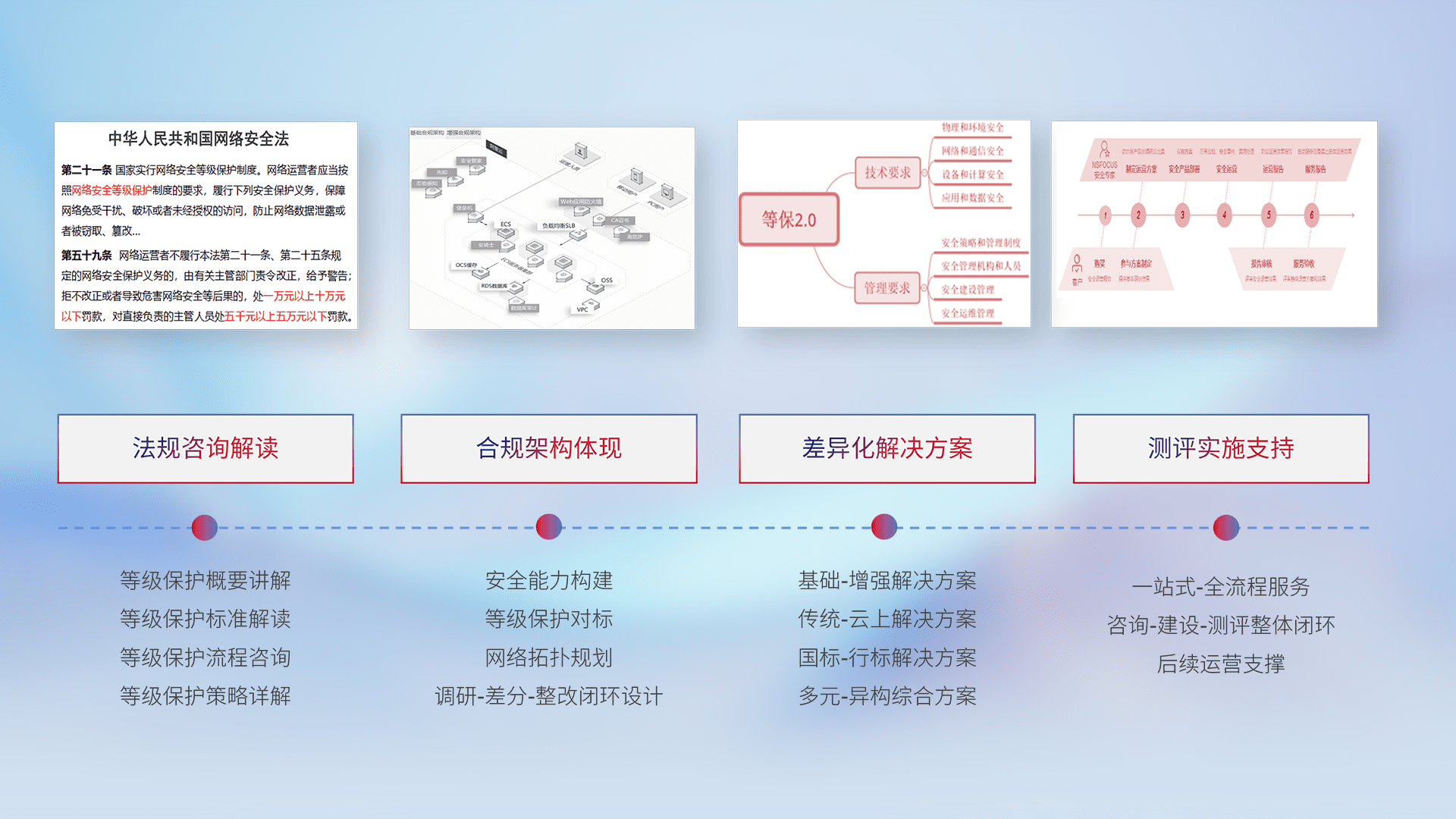 通过专业的法律咨询解读、、、合规架构体现、、、差异化解决方案、、、测试实施支持等服务,,,为客户量身打造等保合规体系。。